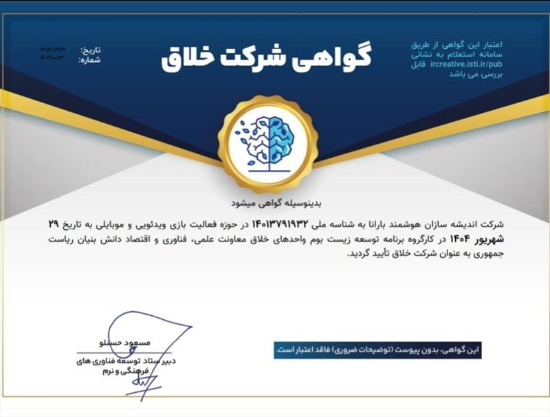 شرکت فناور اندیشه سازان هوشمند بارانا از شرکت های دوره رشد مرکز رشد فناوری نیشابور موفق به اخذ مجوز صنایع خلاق در حوزه فعالیت بازی ویدئویی و موبایلی شد.